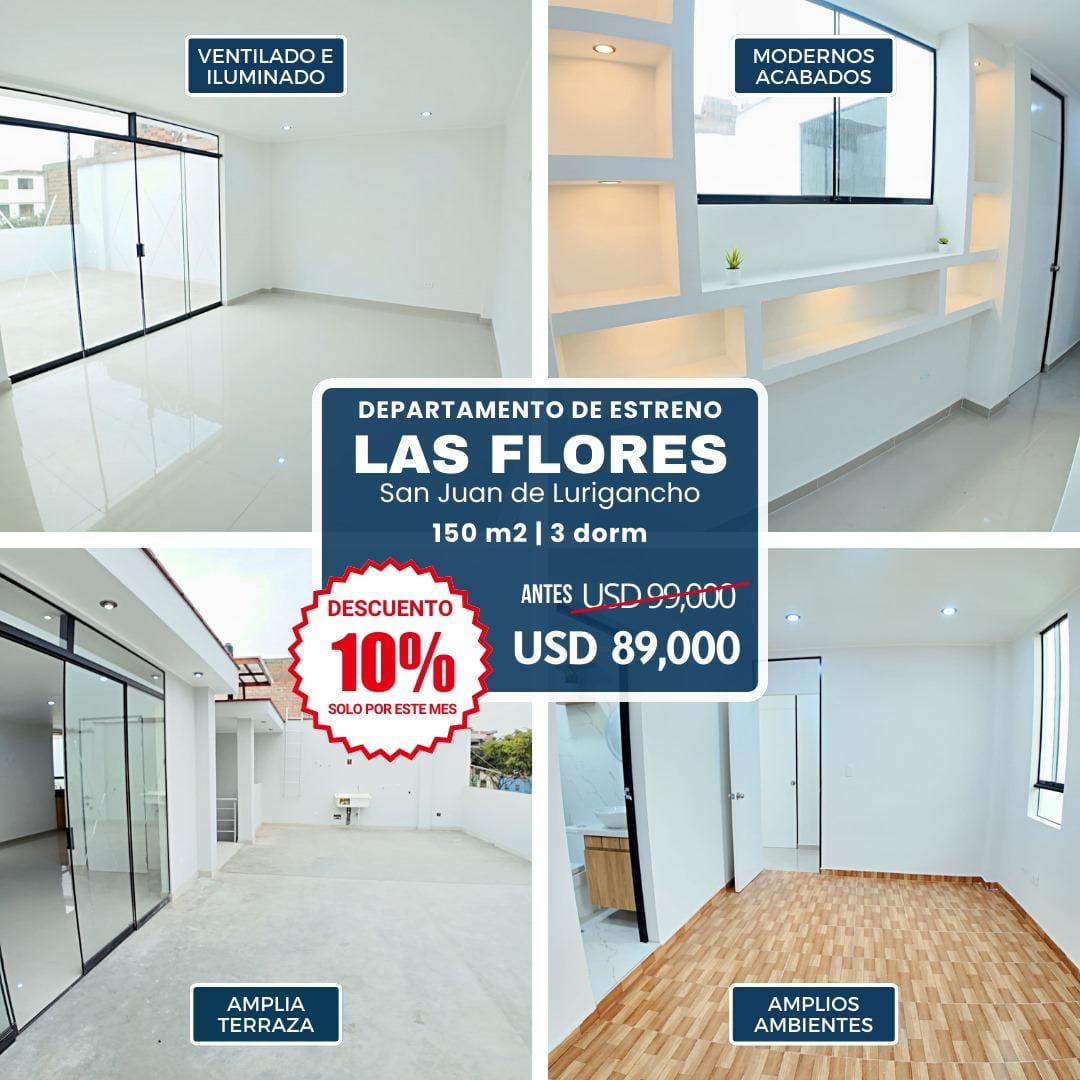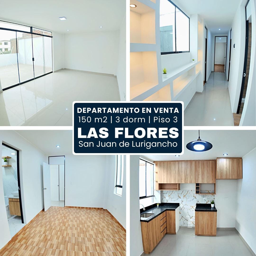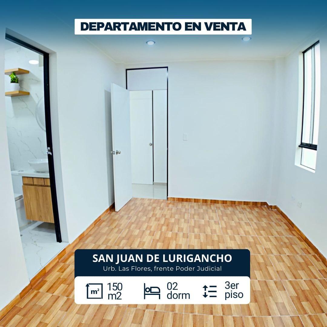 Este departamento en venta en la Urb. Las Flores, San Juan de Lurigancho, es una excelente oportunidad para vivir cómodo y bien ubicado a un precio inmejorable. Se encuentra al costado del Poder Judicial, a solo 2 minutos de la estación Caja de Agua del tren eléctrico y 5 minutos del Mall Aventura SJL, con fácil acceso a centros comerciales, colegios, institutos y principales vías de la zona.